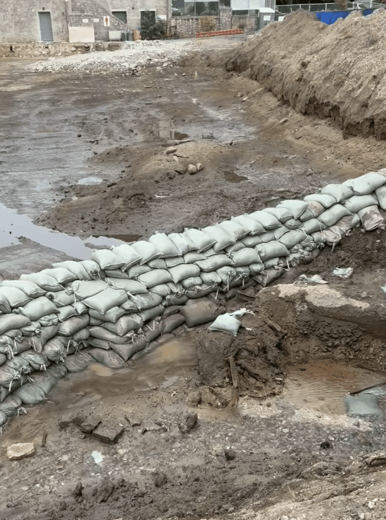 This week, crews are installing a pump and redirection system to prevent water intrusion into the pool area allowing construction to resume.