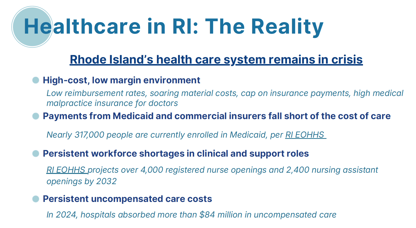 Rhode Island’s healthcare system, like those around the nation, is under real pressure. Hospitals continue to absorb rising costs for labor, supplies, medications and equipment, while payments from insurers and Medicaid continue to fall short of the actual cost to care. At the same time, thousands of Rhode Islanders may lose health coverage, driving more patients to emergency departments without the means to pay. In 2024 alone, Rhode Island hospitals absorbed more than $84 million in uncompensated care. If even a fraction of newly uninsured patients rely on emergency rooms, inpatient units, or outpatient clinics for the care they need, uncompensated care costs will climb sharply, further jeopardizing hospitals’ financial stability and services.