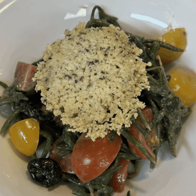 We Cook! Mill’s Tavern Poached, Chilled Sea Bean Salad. Dried Tart Cherries, Cherry Tomatoes, Crispy Parmesan