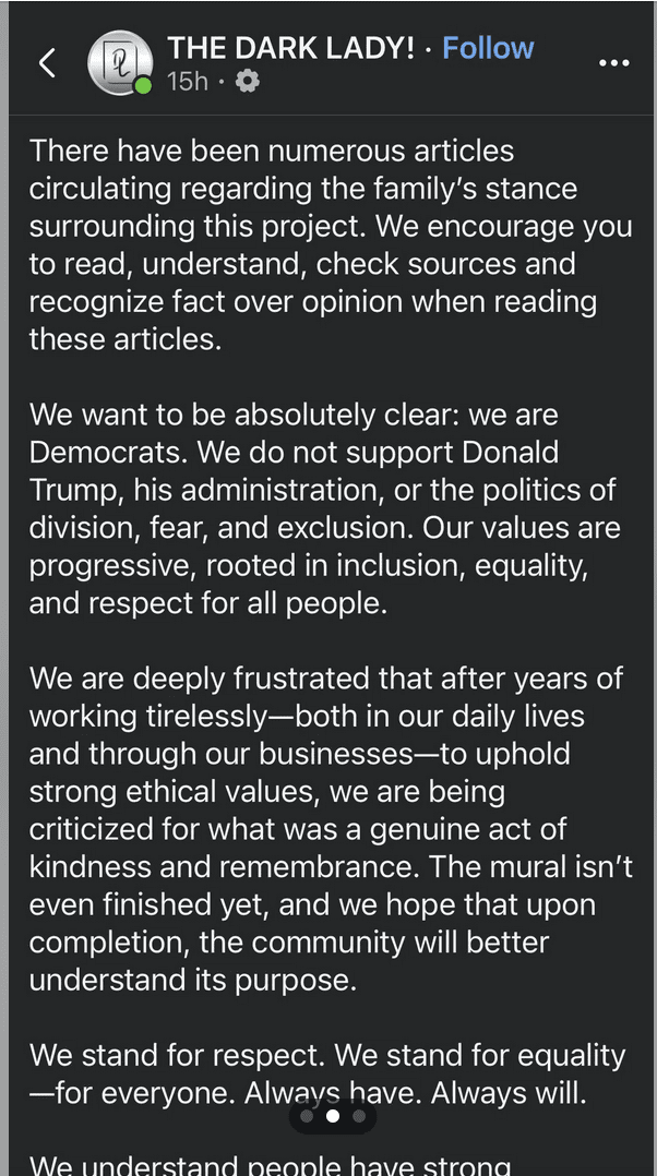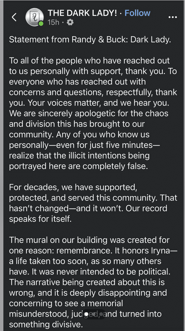“The mural on our building was created for one reason: remembrance,” the statement reads. “It honors Iryna—a life taken too soon… It was never intended to be political.”