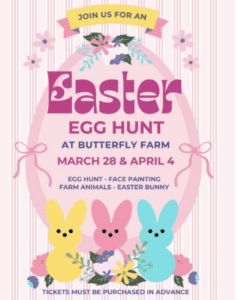 It’s the 4th annual Easter Egg Hunt at the farm! Search for Easter eggs in their fields, visit with your favorite farm animals, see some of the new lambs and calves that have been born, visit with the Easter Bunny and get your face painted!