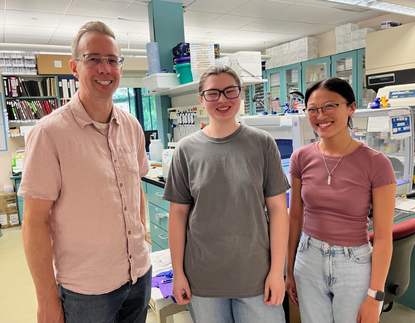 - T.J. McGreevy ’98 ’03 ’09 left, directs URI’s Wildlife Genetics & Ecology Laboratory; shown with students Margarita Savage and Maelyn Kelly.