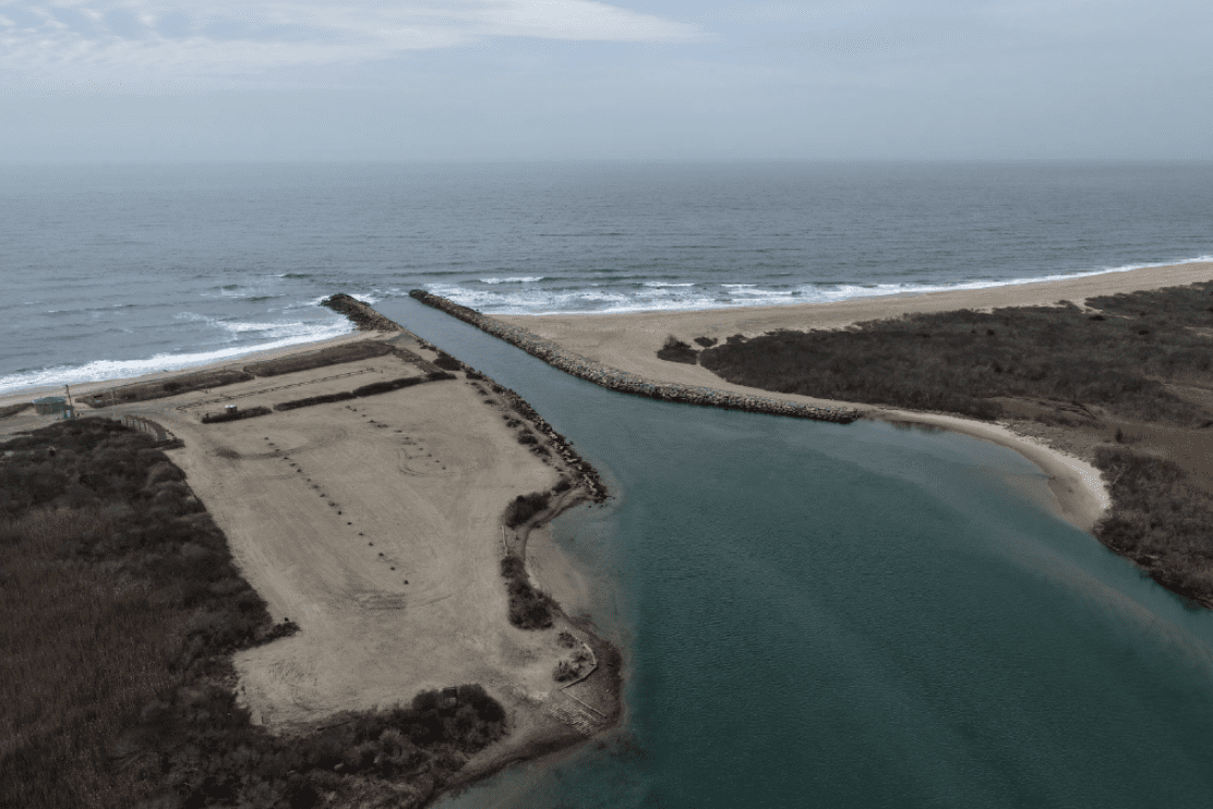 Contractors reconstructed the west breachway wall in two tiers of stone. Dredged material was reused to restore the town beach, repair erosion along the wall’s west side, and construct two storm-resilient dunes on the same side. The work has restored the breachway’s structural integrity, improved navigation, stabilized the coastline against climate impacts, and preserved water flow in and out of Ninigret Pond to maintain ecological balance and water quality.