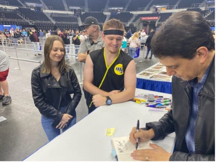 The list of pop culture icons is impressive. From Karate Kid and Cobra Kai fame, Ralph Macchio, William Zabka and Elizabeth Shue were in attendance. The long line for a photo with these three illustrates just how popular they are. Michael Kelly and Kelsey Ling of North Providence (both architectural designers) are big fans of Cobra Kai. They wanted a photo with Ralph Macchio, who plays Daniel LaRusso. The couple were aware of the fact that Macchio had recently celebrated a birthday, so they presented him with a card. Kelly also had Macchio sign a copy of his book to add to his Cobra Kai collection. If you are familiar with the program, you know there is Eagle Fang Karate, Miyagi Do Karate and of course Cobra Kai which Michael Kelly was representing in uniform.