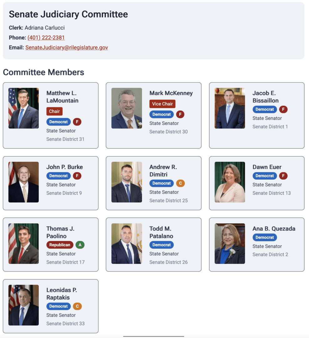 The Senate Judiciary Committee is chaired by Sen. Matthew L. LaMountain (D-Dist. 31, Warwick, Cranston).