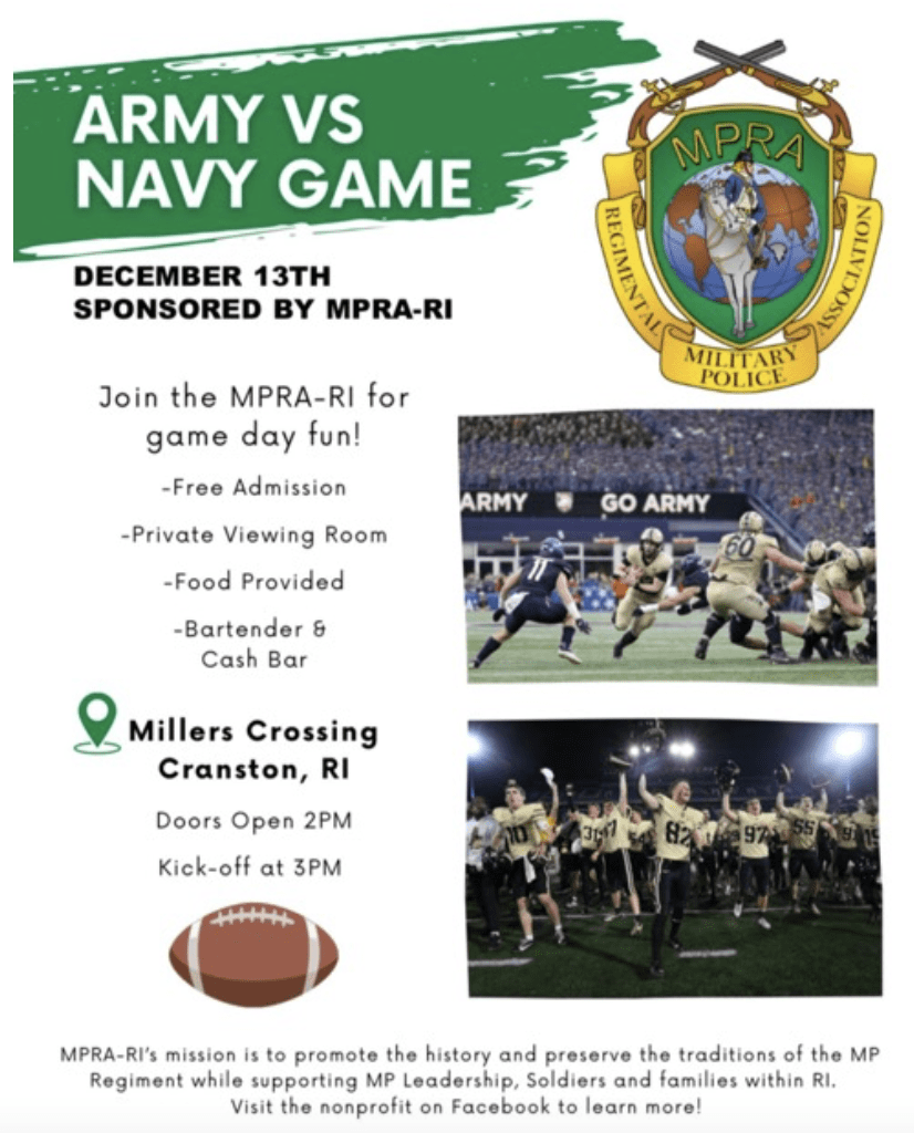 Millers Crossing, Cranston, RI. 2:00 pm , kickoff 3:00 p.m. The MPRA-RI will be hosting an Army-Navy Game viewing party this Saturday, 13 December 2025, at Millers Crossing in Cranston, RI. Doors will open at 2:00pm with the Kickoff at 3:00 pm. Admission is free and food will be provided along with a cash bar. Hope to see you all there!