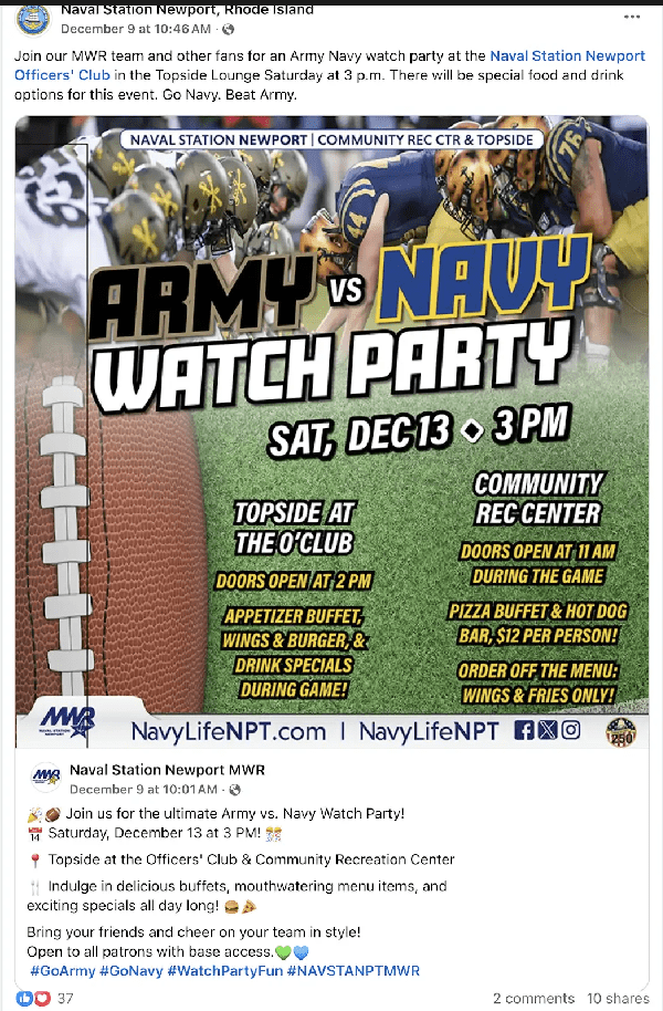 Saturday, December 13, 2025 – Army-Navy Game Viewing Party
